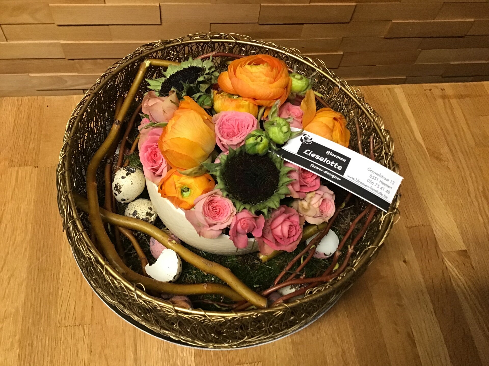 Deze is opgewerkt met lentebloemen en paasartikkelen .