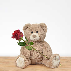 Deze bruine knuffel met roos is iets kleiner dan de witte beer.