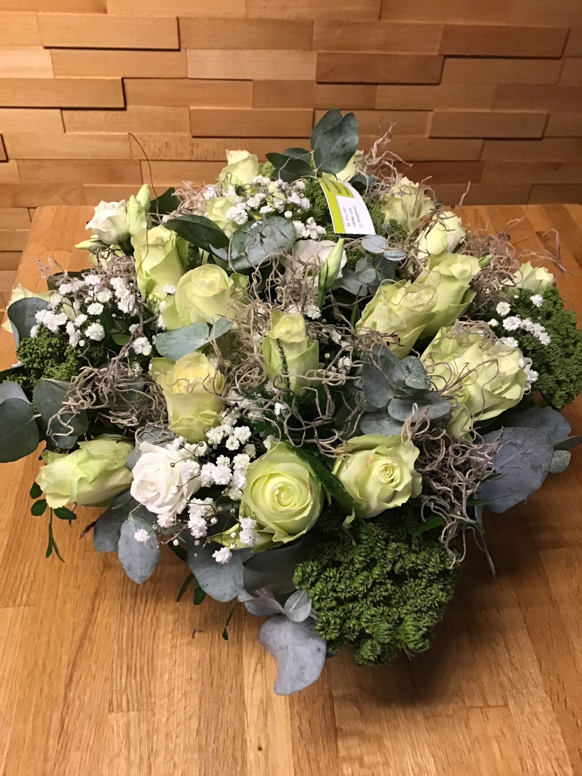 Dit wit bloemstuk met witte rozen is zeker een topper ,afgewerkt met verschillende groen soorten ,deze kan ook in andere kleuren gemaakt worden.