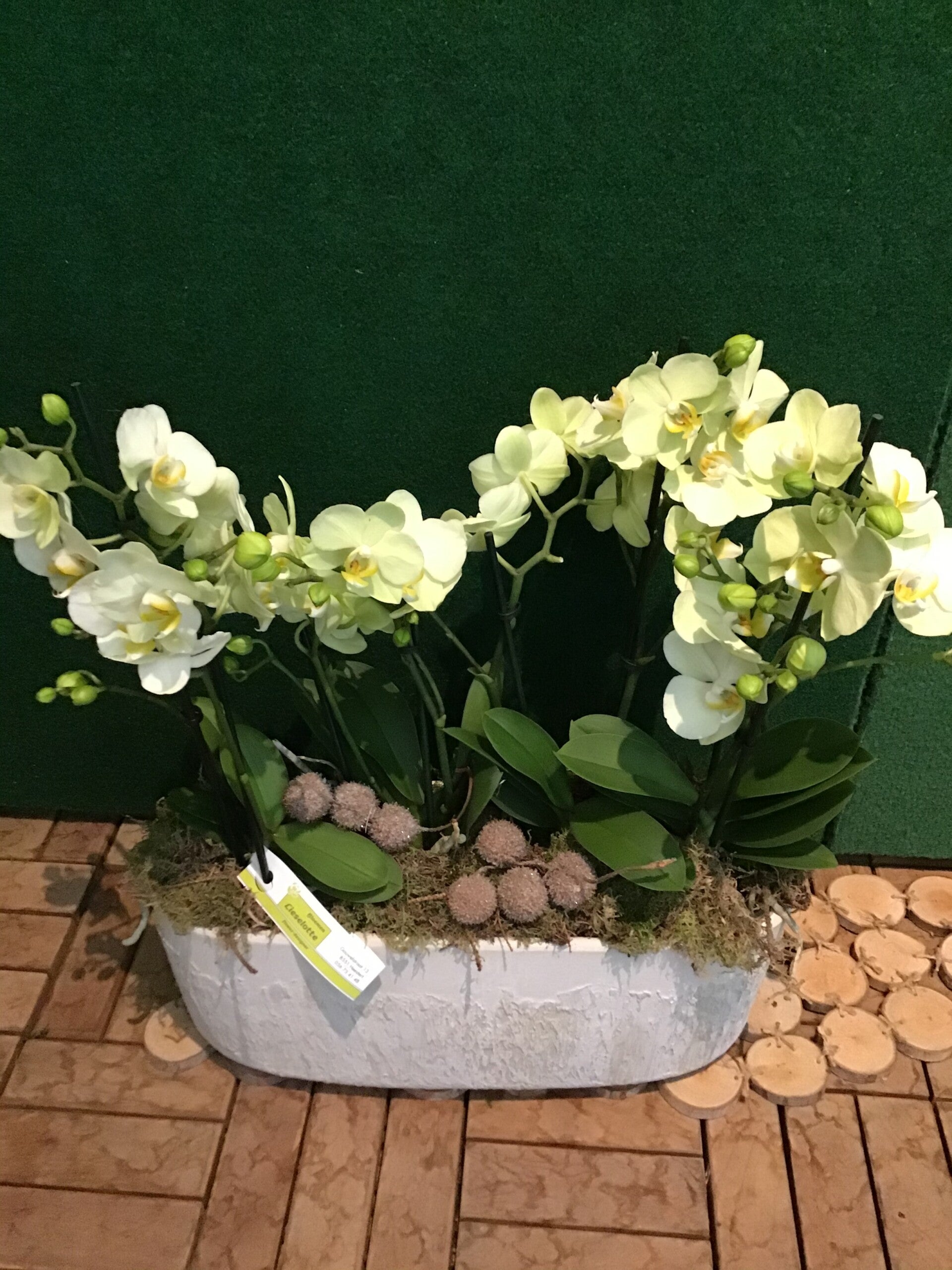 Deze groene orchideeën staan prachtig in deze langwerpige stenen pot .