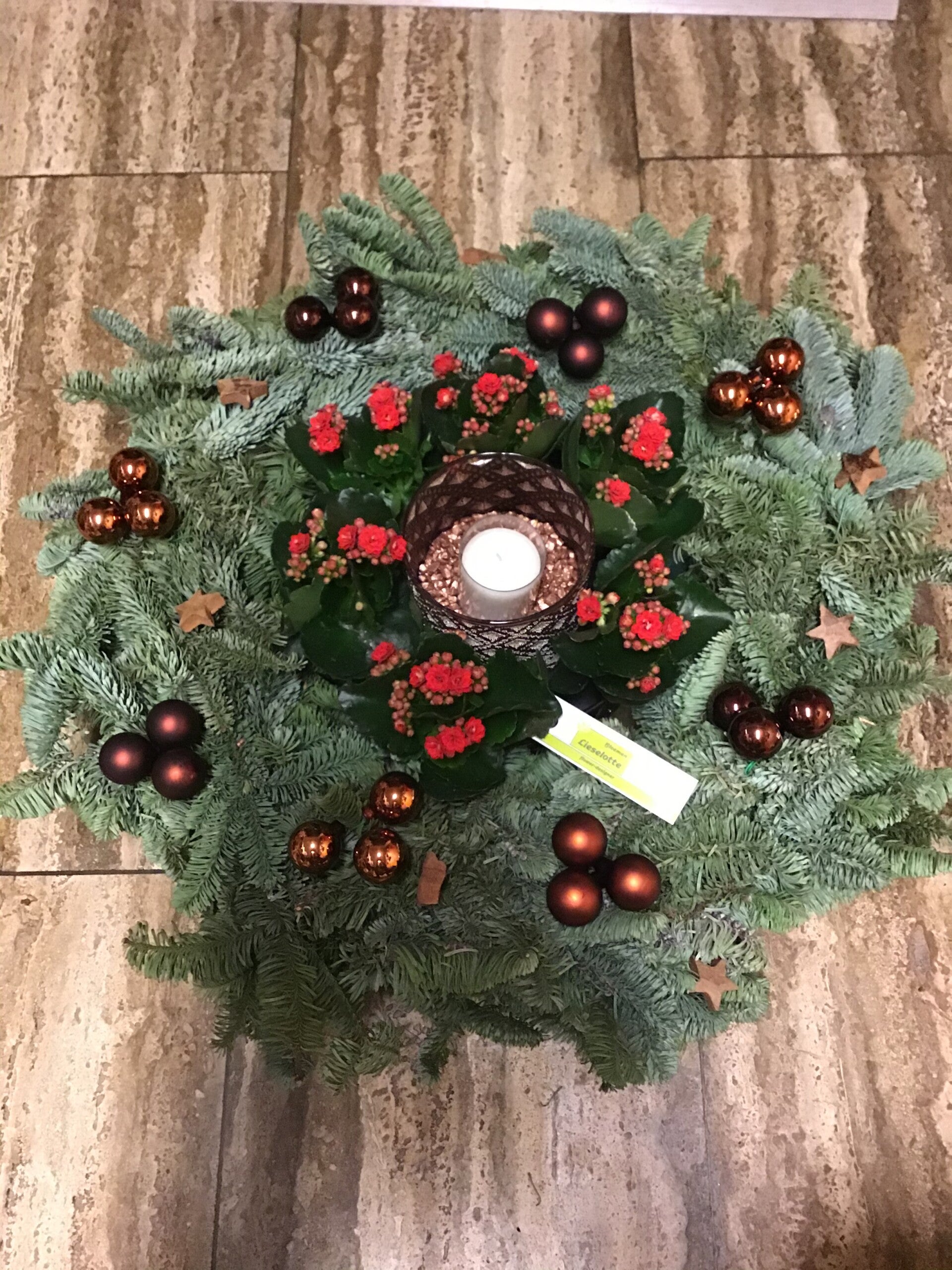 Deze is een blikvanger op de tafel,krans ligt op schaal met in de midden een th-licht die rondom met plantjes zijn verwerkt.