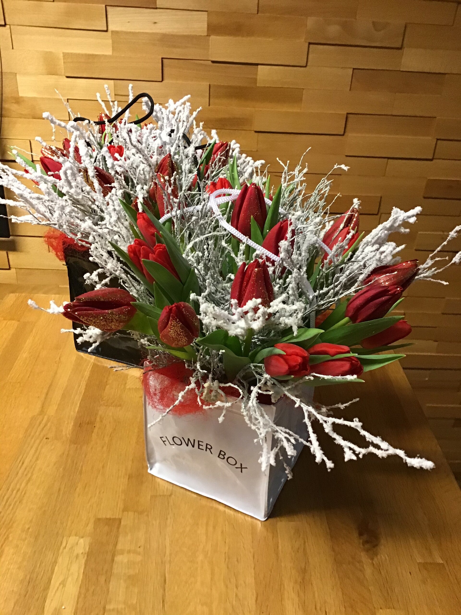 Deze is nu gevuld met rode tulpen met takken , kan ook in een andere combinatie , vraag ernaar.