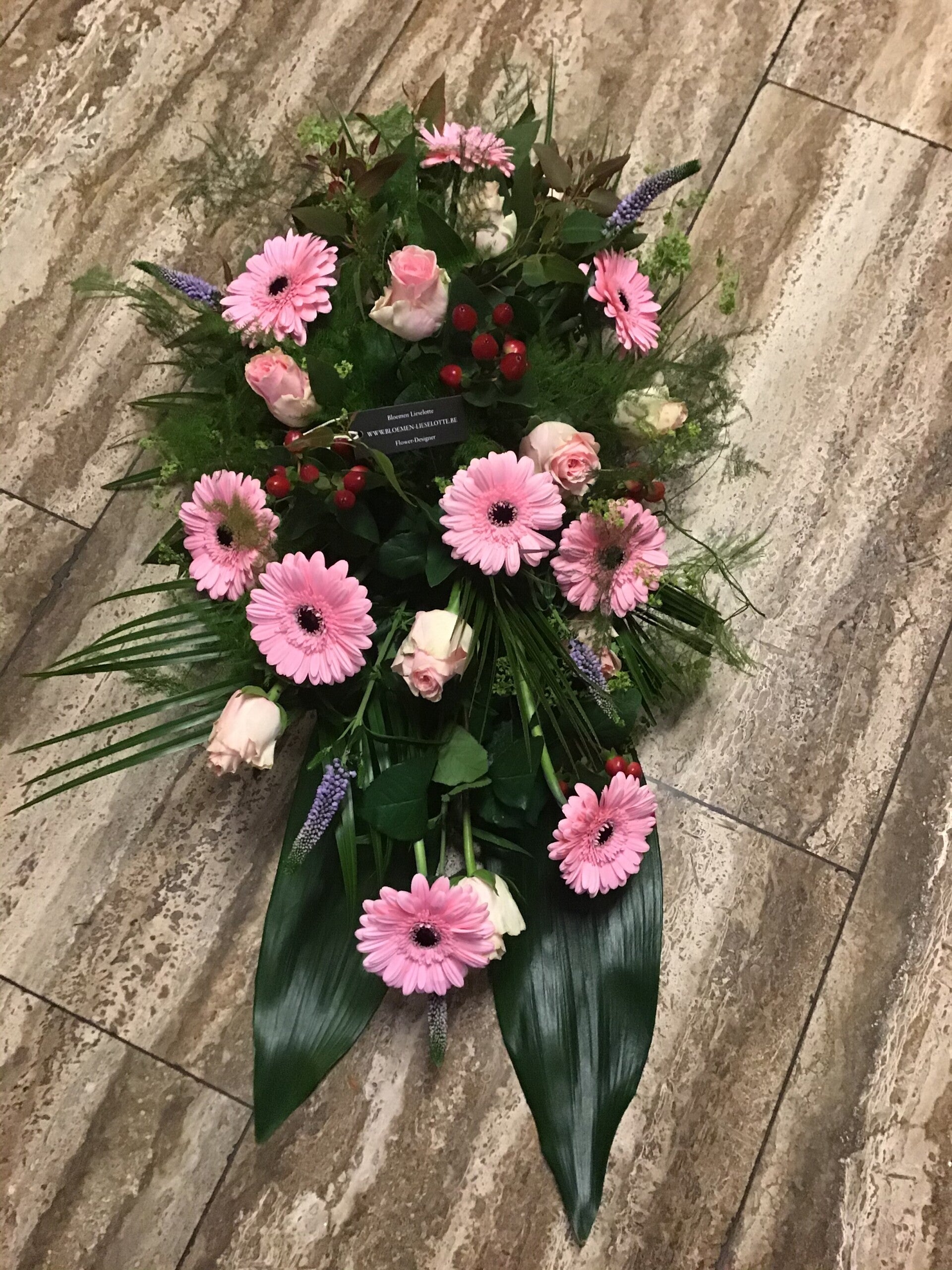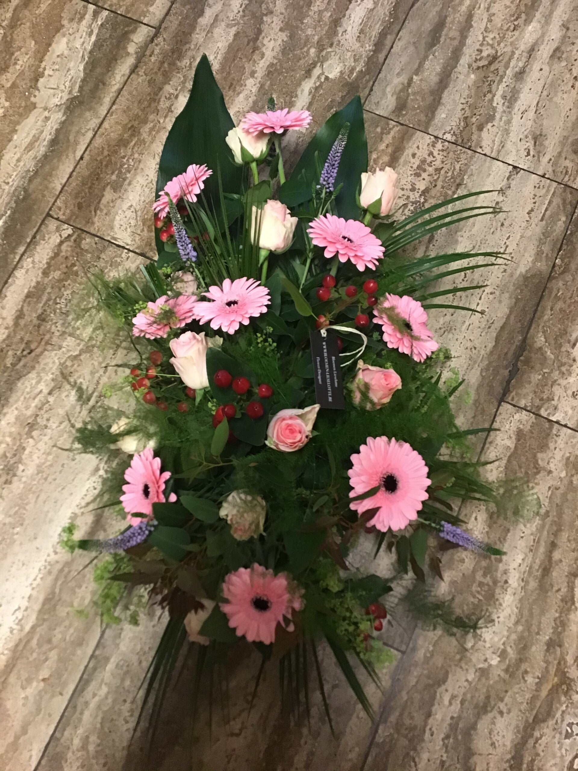 Deze is 80 cm groot , opgewerkt met roze bloemen , kan ook in andere kleuren gemaakt worden.